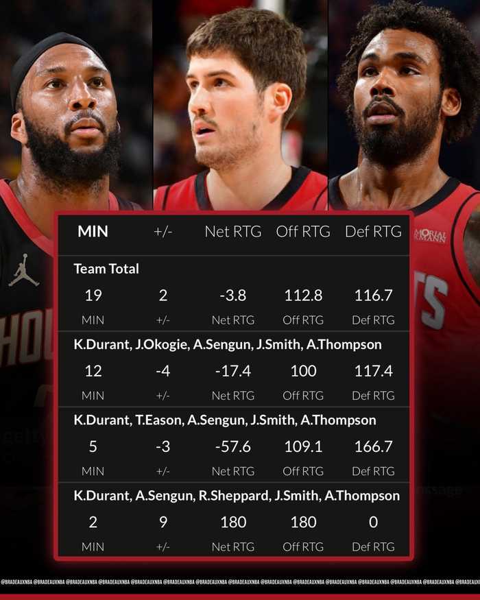 火媒Bradeaux: 本届季后赛,火箭队以阿门、KD、小贾、申京4名首发为固定班底的搭配阵容,相关数据如下: • 搭配奥科吉:登...